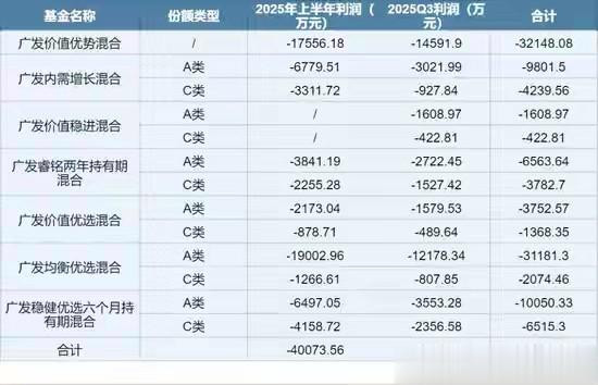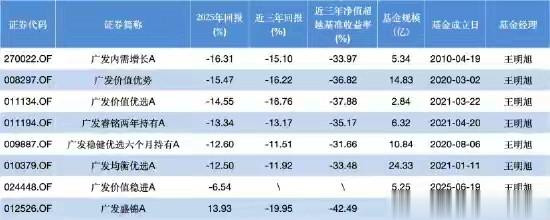 Wind数据显示,2025年有业绩记录的4711只主动权益类基金中,4494只实现正收益,TOP10产品收益率均超130%,最高达233%。然而王明旭独立管理的7只基金全年全部亏损,其中6只闯入年度跌幅前30,4只位列倒数前十,广发内需增长A以-16.31%的收益率领跌,广发价值优势、广发价值优选A等跌幅均超14% 。截至2025年前三季度,这些基金累计亏损高达11.35亿,仅管理费就收取5594万,"旱涝保收"的模式引发基民强烈不满。